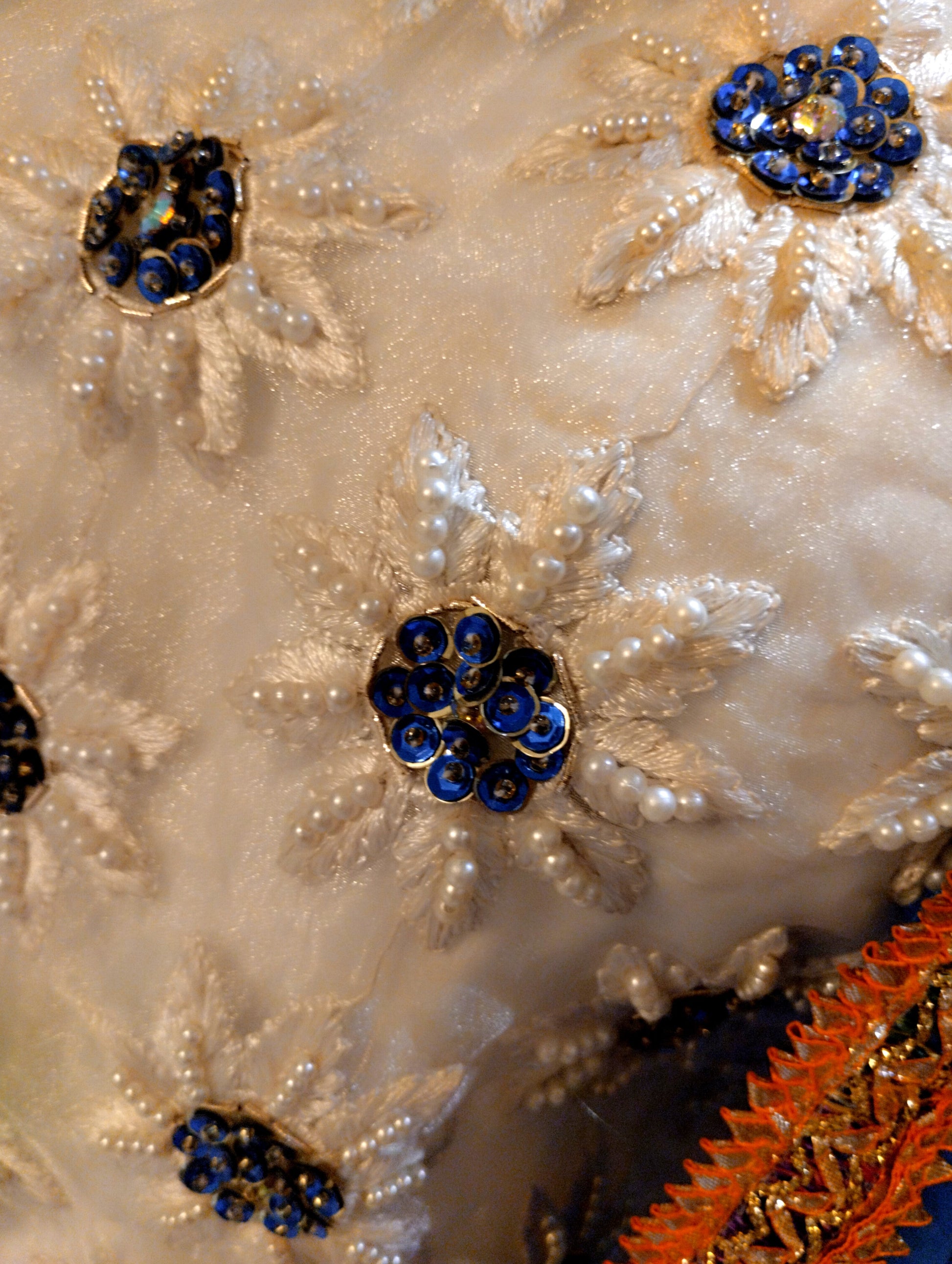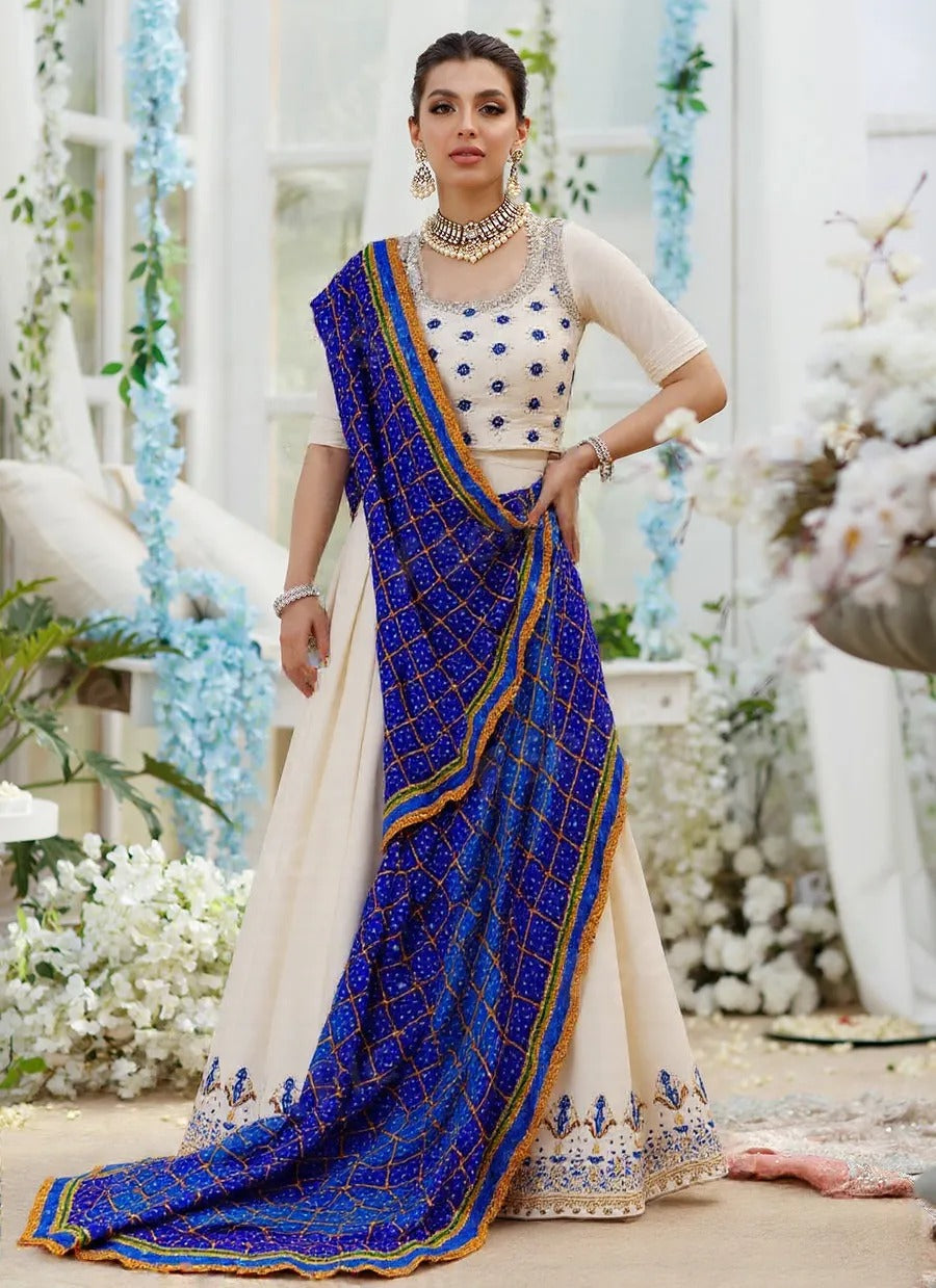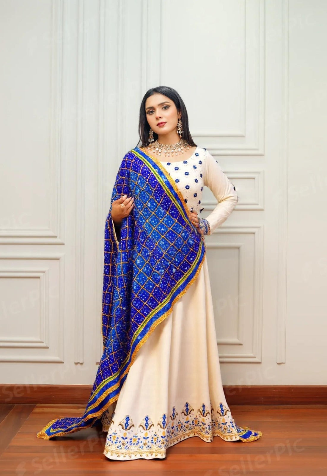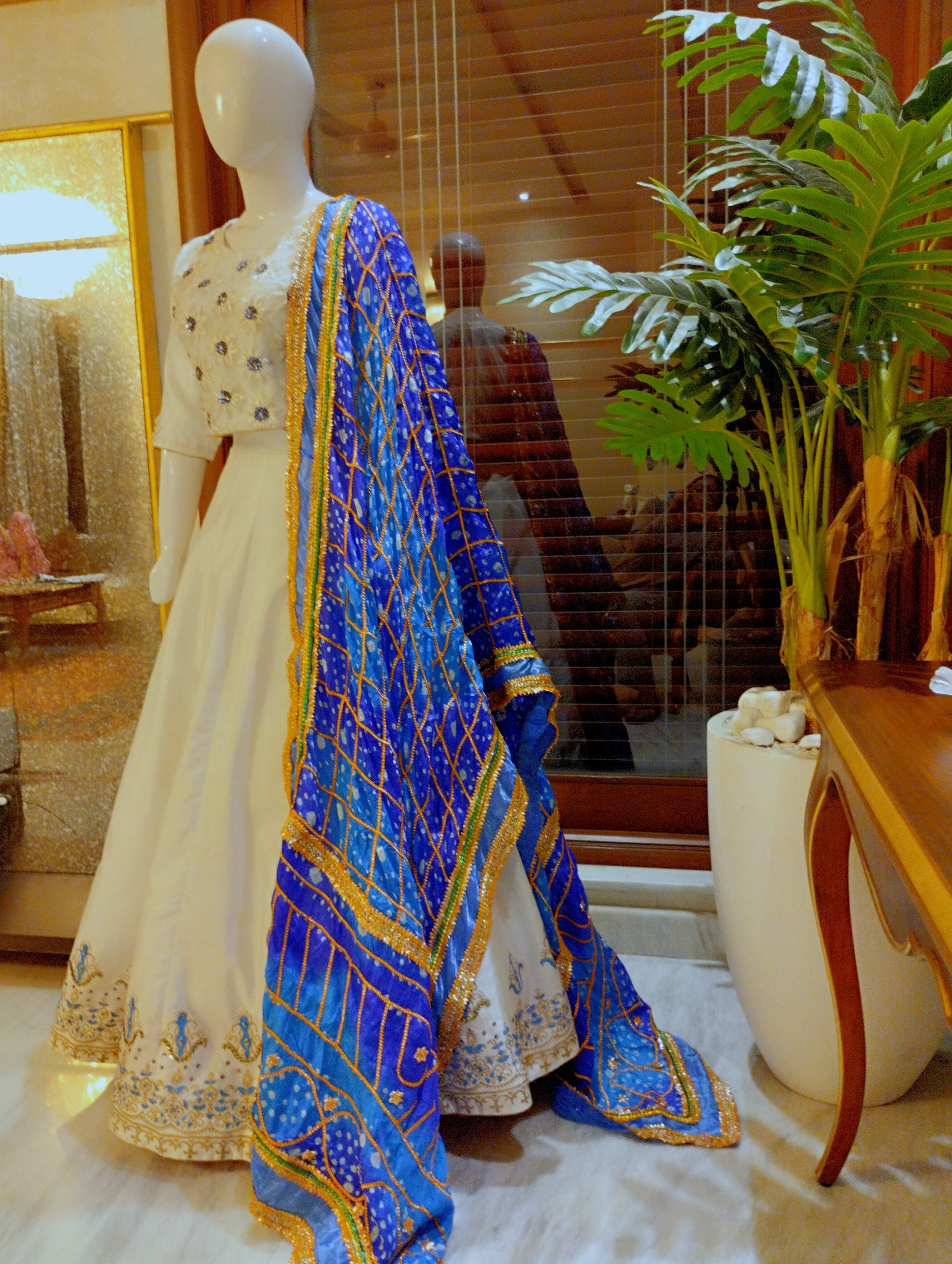 unleash your ethereal grace with ivory white cholli & same block print lehnga , this elegant organza cholli features heavily embrioded bodice with intricate details . it comes with ivory white block print+pearl+sitari work lehnga which add a touch of traditional elegance to the outfit . the four sided gotti worked indian chunri silk dopatta with all over jall enhances the allure .
