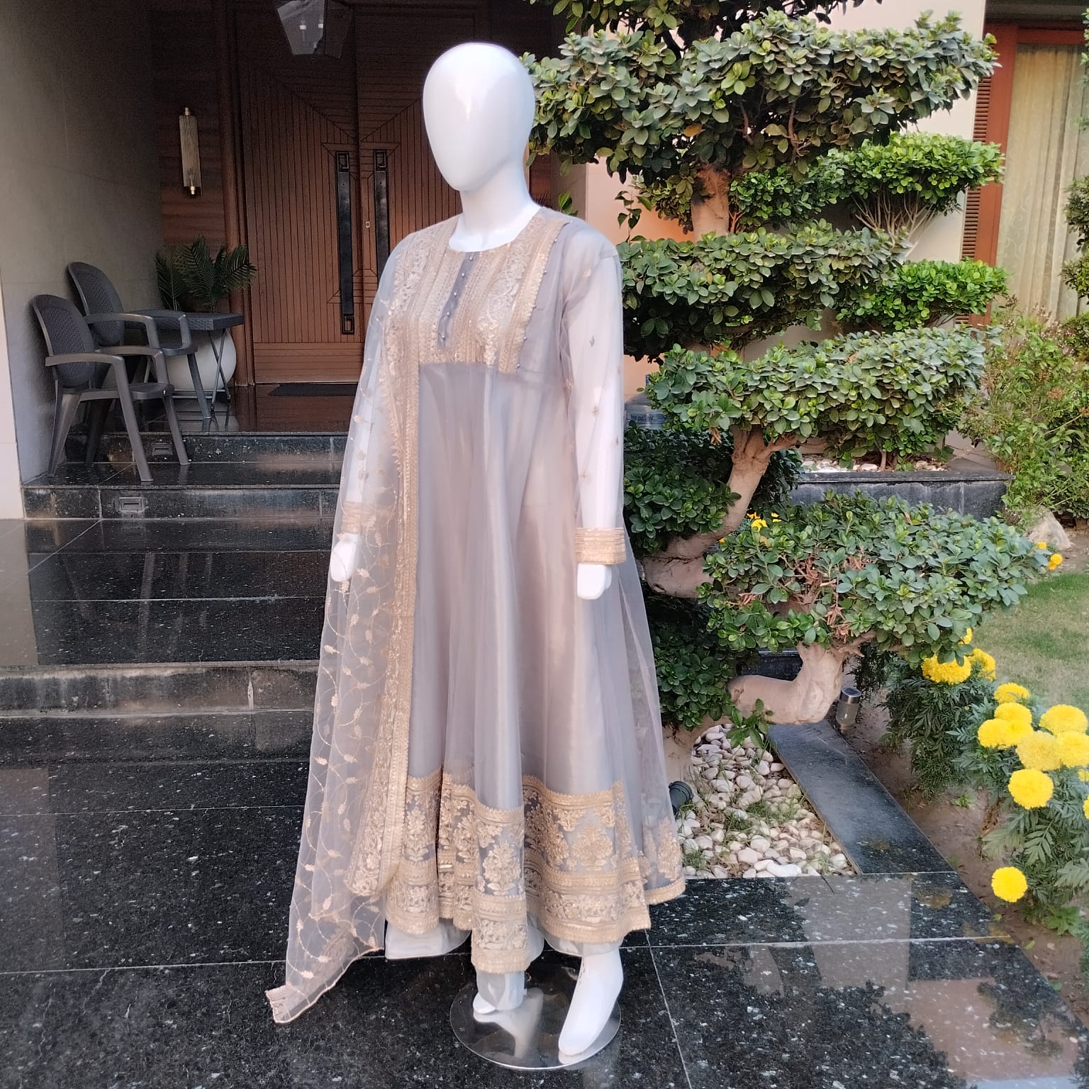 Silver Grey elegance in this embroided luxury maxi adorned with heavy cream gold resham work on big flair bottom & bodice, paired with heavy jaal net dopatta. perfact for your next celebration.