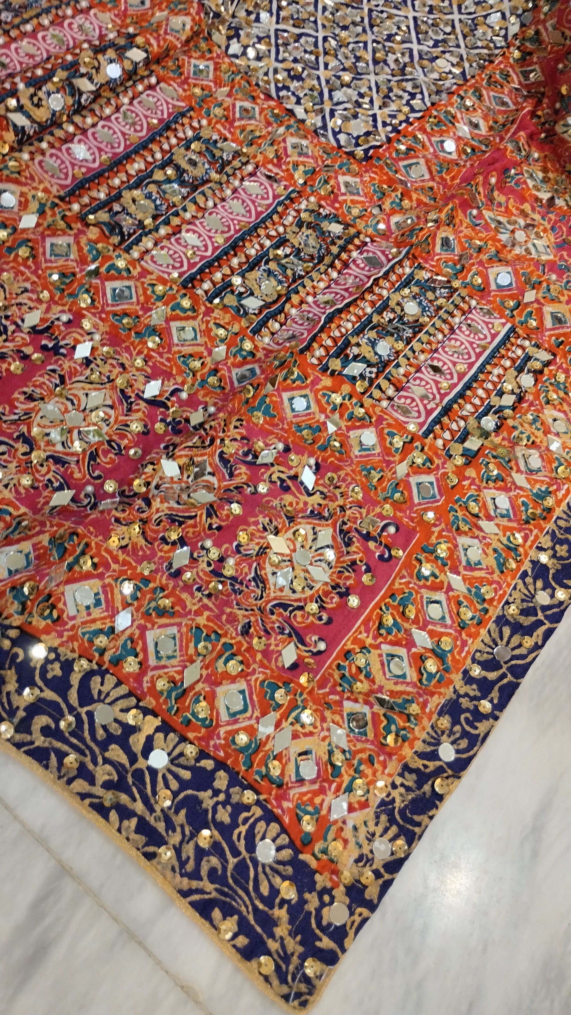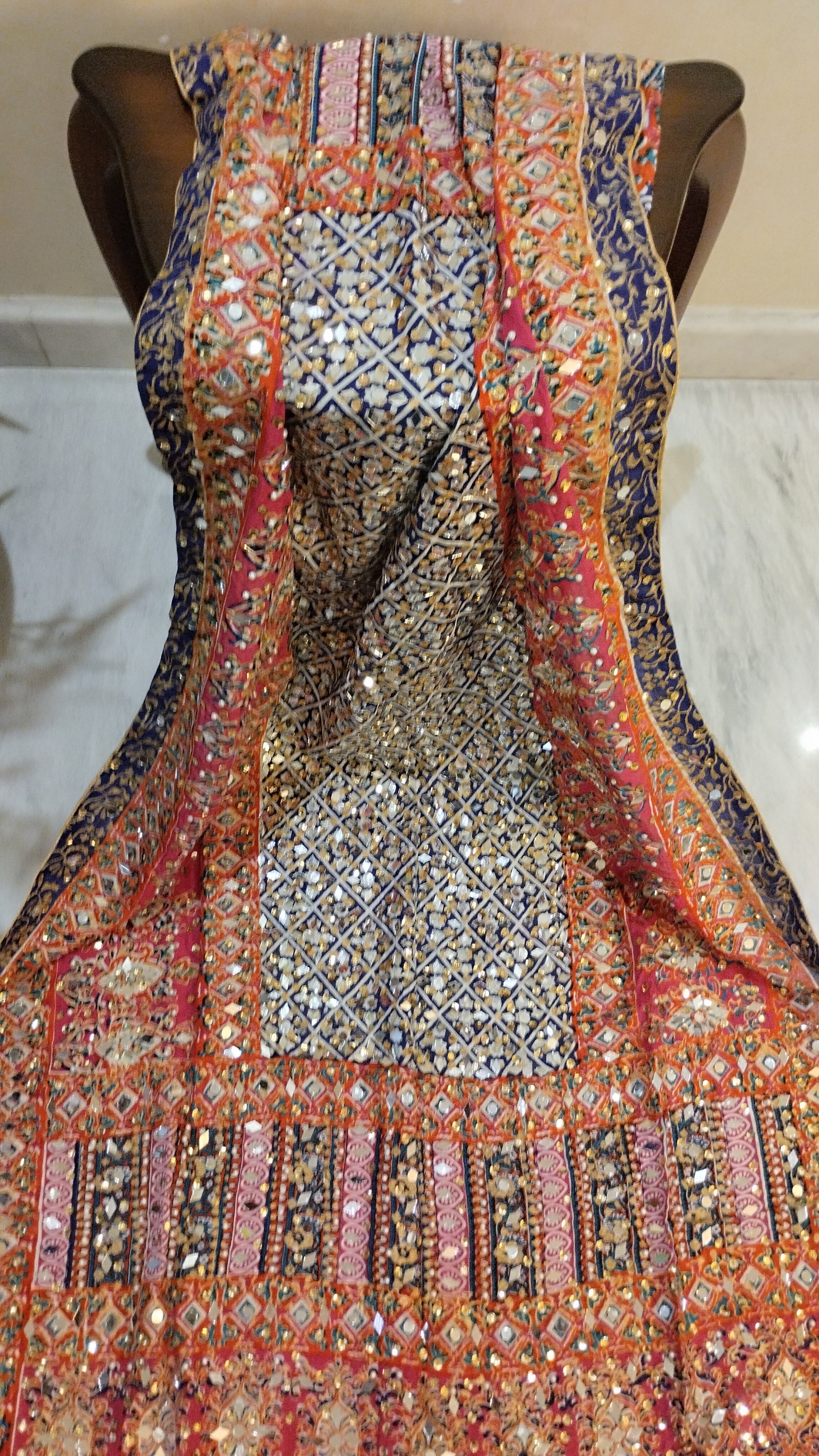 The Sohni Shawl is a luxurious crepe silk piece, hand-printed and adorned with intricate heavy mirror work, pearls, and tilla embroidery. As a signature item from our fancy shawl collection, it offers an exquisite blend of traditional craftsmanship and elegance, making it an ideal accessory for weddings and special occasions.