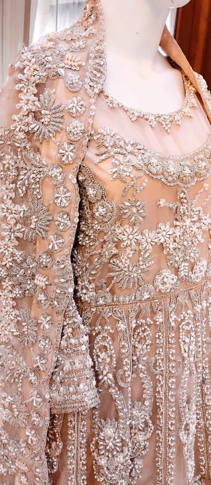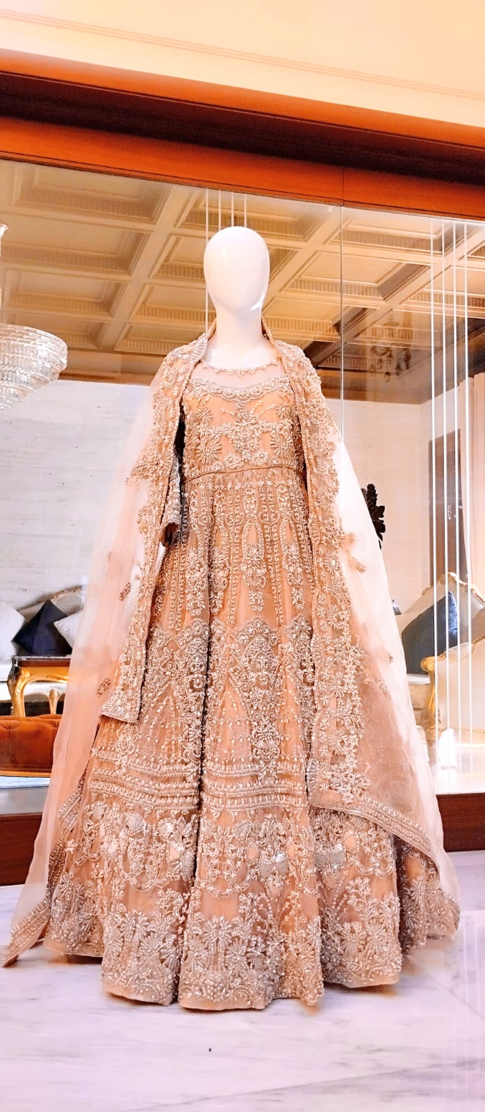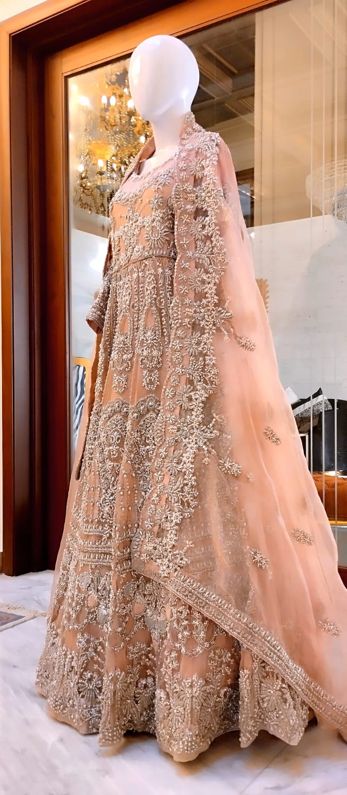 This bridal outfit in soft tea pink features carefully crafted embellishments that enhance its royal elegance. Designed to provide the bride with a majestic and refined appearance, the ensemble balances subtle color with intricate detailing for a sophisticated wedding day look.